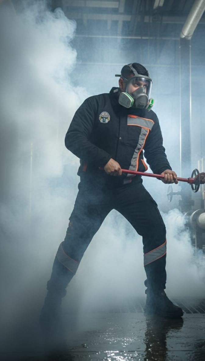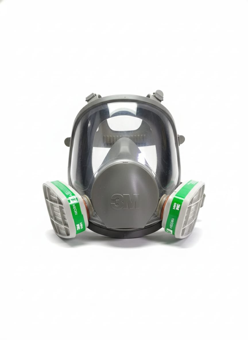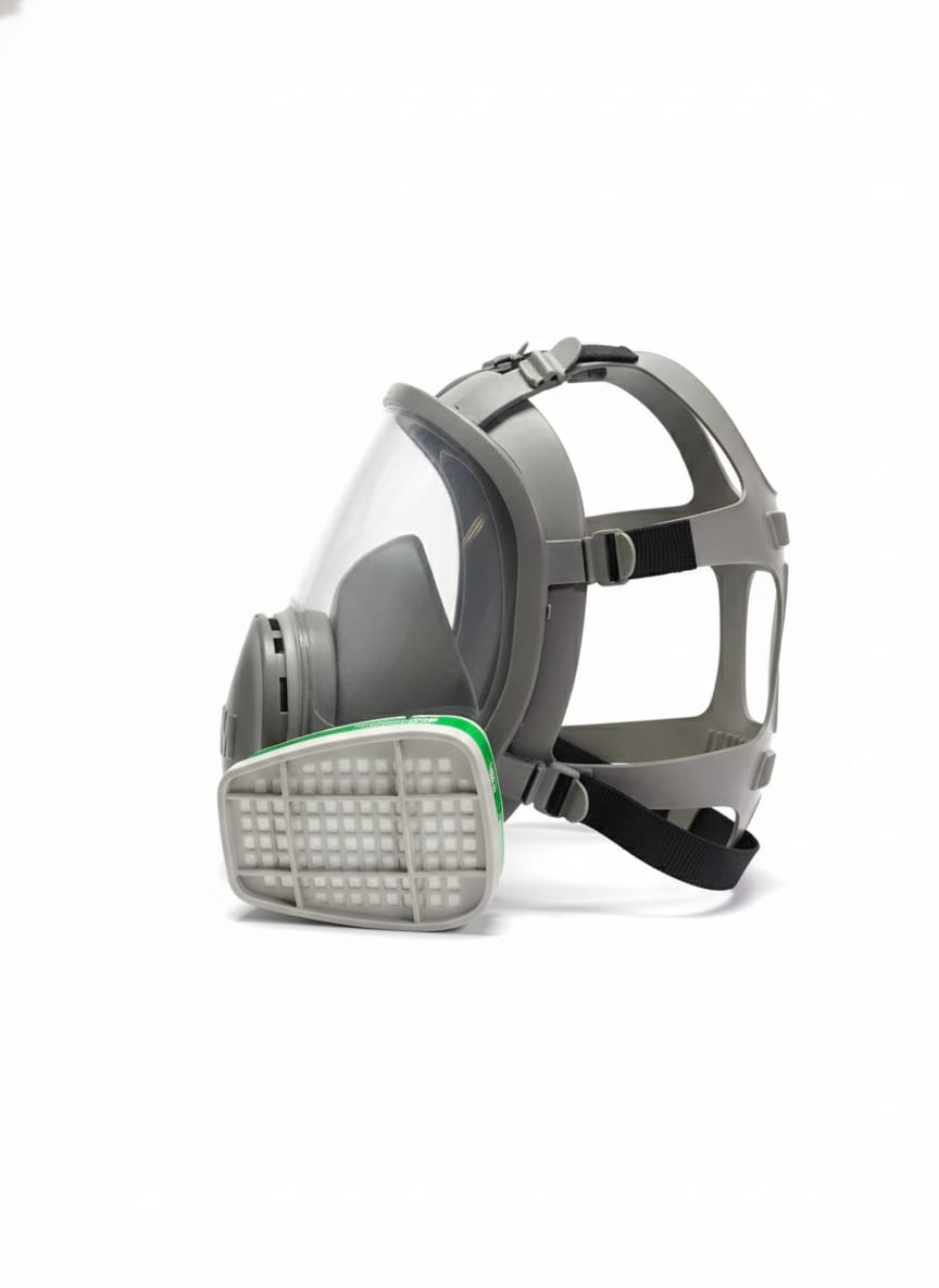 equipada con filtros laterales reemplazables. Está diseñada para brindar protección contra gases, vapores y partículas tóxicas, comúnmente usada en entornos industriales, químicos o de rescate. Su visor amplio ofrece buena visibilidad y el sello facial garantiza un ajuste seguro.