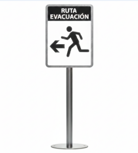 - Pictograma: Diseño normalizado con la leyenda “RUTA DE EVACUACIÓN” y flecha indicativa hacia el lado izquierdo.