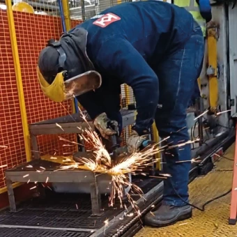Simulación de trabajos con soldadura, corte y esmerilado. Aprende a mitigar riesgos de chispas, llamas y explosiones, y el uso de equipos contra incendios.